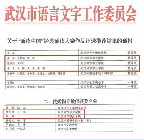 雅言传承文明,经典浸润人生。近日,由教育部和国家语委联合主办的中华经典诵写讲大赛武汉赛区传来喜讯,我校报送参加“诵读中国”经典诵读大赛的三件作品全部斩获特等奖。杜宇虹、张婷、王乐三位老师获评优秀指导教师。
