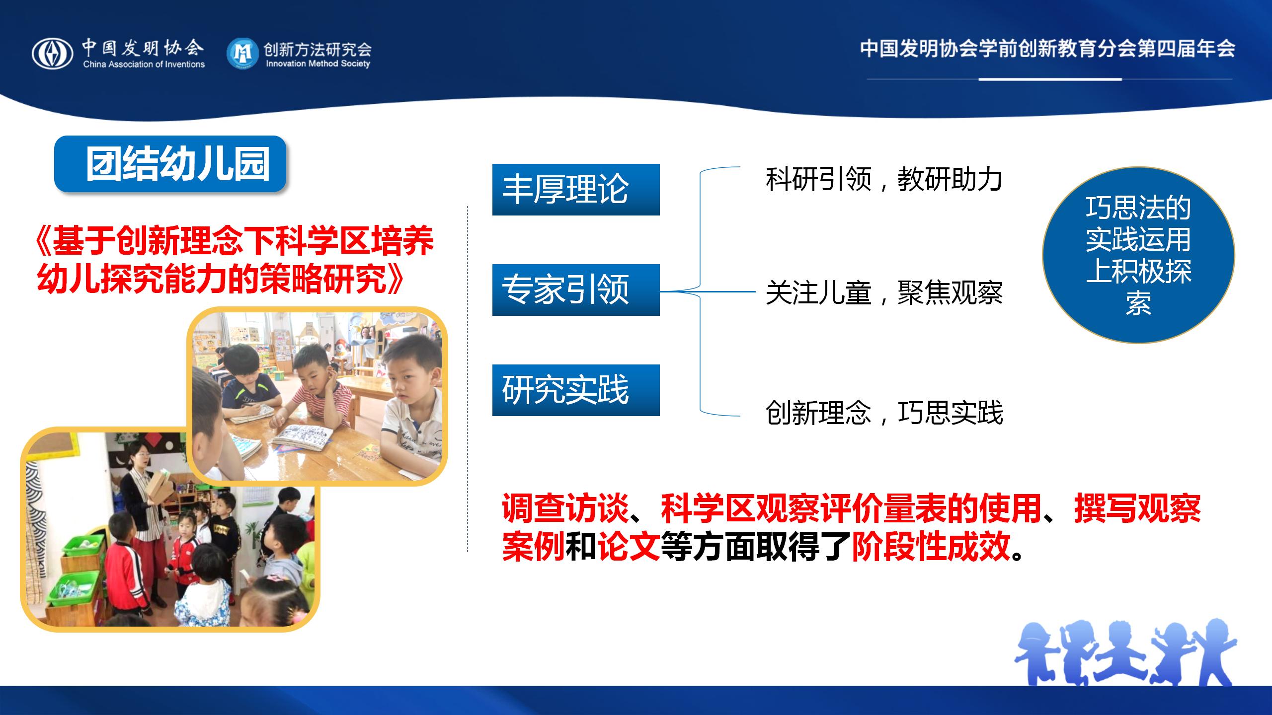 《基于创新理念下科学区培养幼儿探究能力的策略研究》从丰厚理论、专家引领、研究实践三个层面开展各项活动,呈现出“科研引领,教研助力;关注儿童,聚焦观察;创新理念,巧思实践”三个特点,并在调查访谈、科学区观察评价量表的使用、撰写观察案例和论文等方面取得了阶段性成效。在巧思法的实践运用上积极探索,不仅在课题推进过程中从界定的科学区入手践行巧思法,还大胆将巧思法渗透到幼儿园各岗位工作中,使得园所工作更为有效。