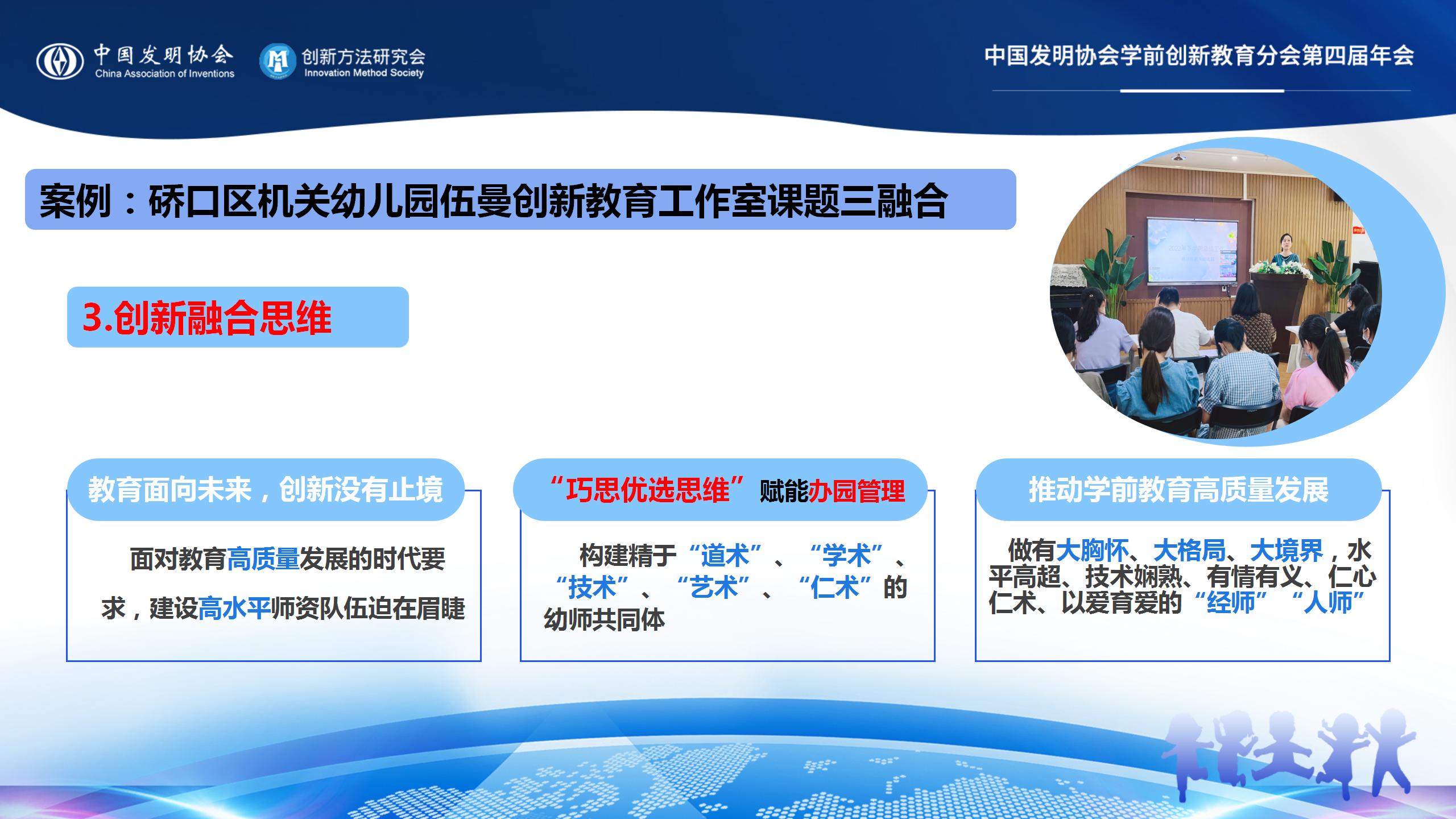 硚口区机关幼儿园伍曼创新教育名园长工作室课题“三融合”经验值得推广:创新融入课题;创新融合游戏;创新融入思维。