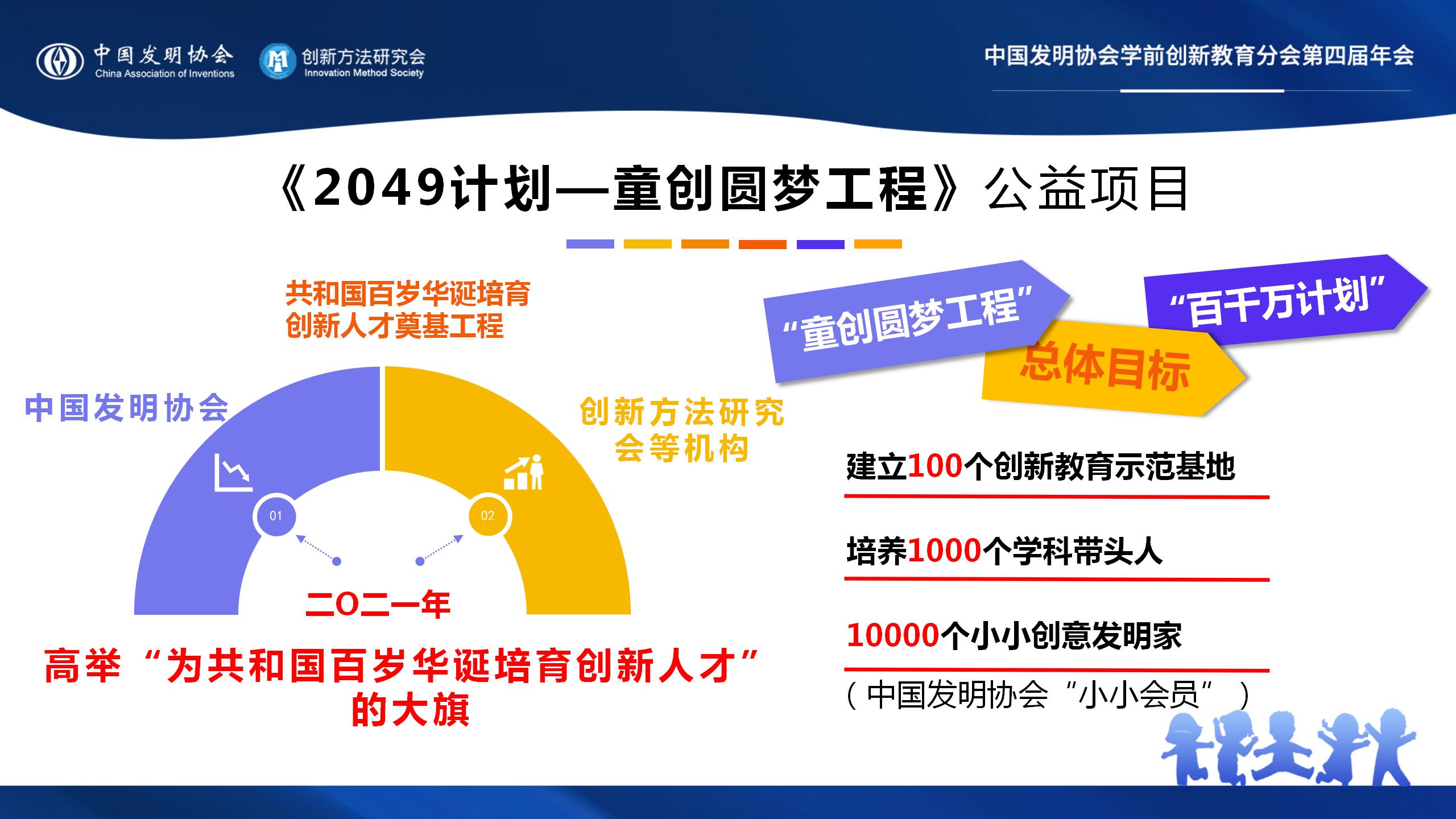 “2049计划—童创圆梦工程”的目标是要实现“百千万计划”:建立100个创新教育示范基地;培养1000个学科带头人;10000个小小创意发明家。