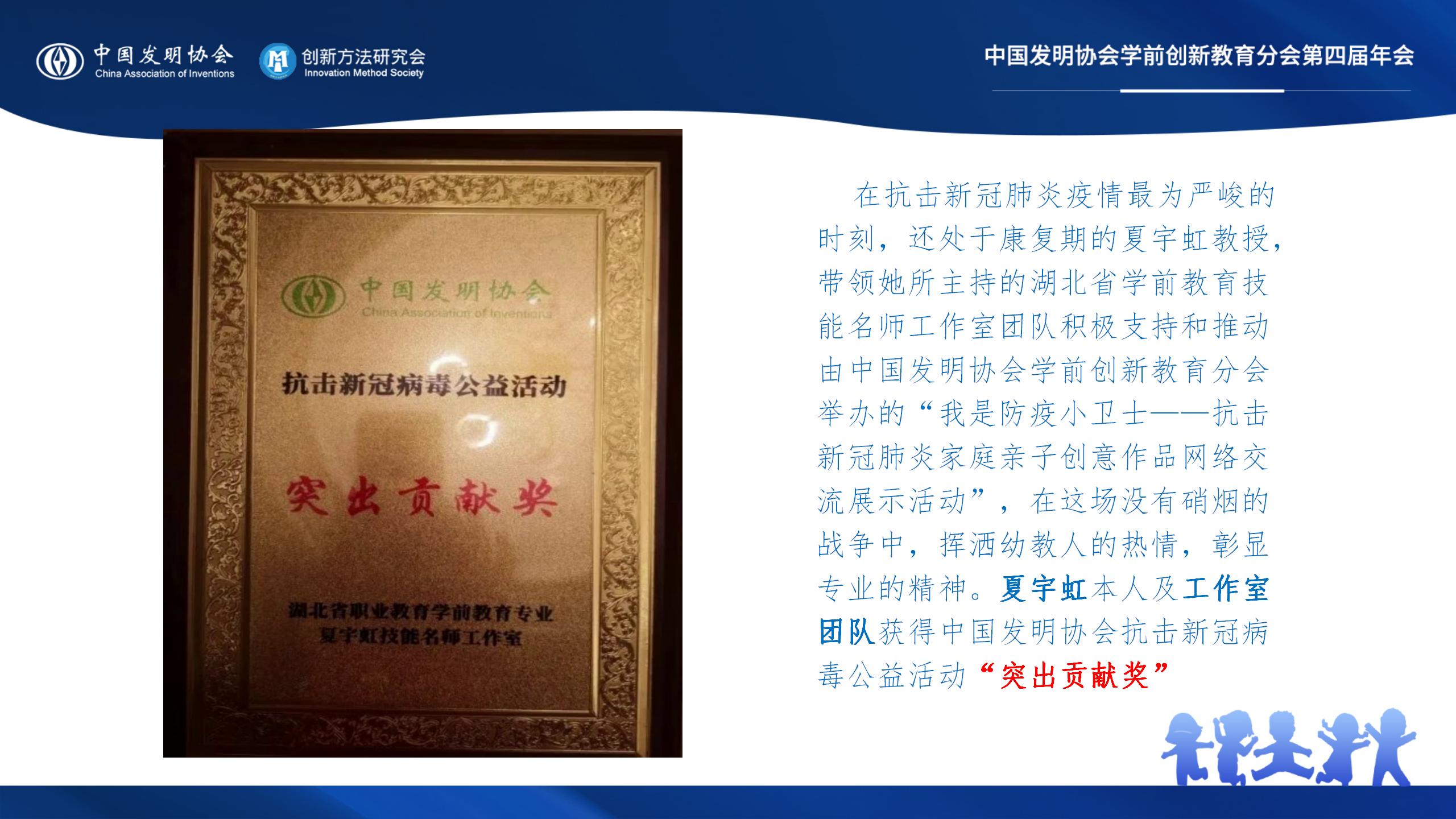 夏宇虹本人及她主持的湖北省职业教育学前教育专业技能名师工作室工作室因在疫情中间的出色表现,她本人及团队获得中国发明协会抗击新冠病毒公益活动“突出贡献奖”。