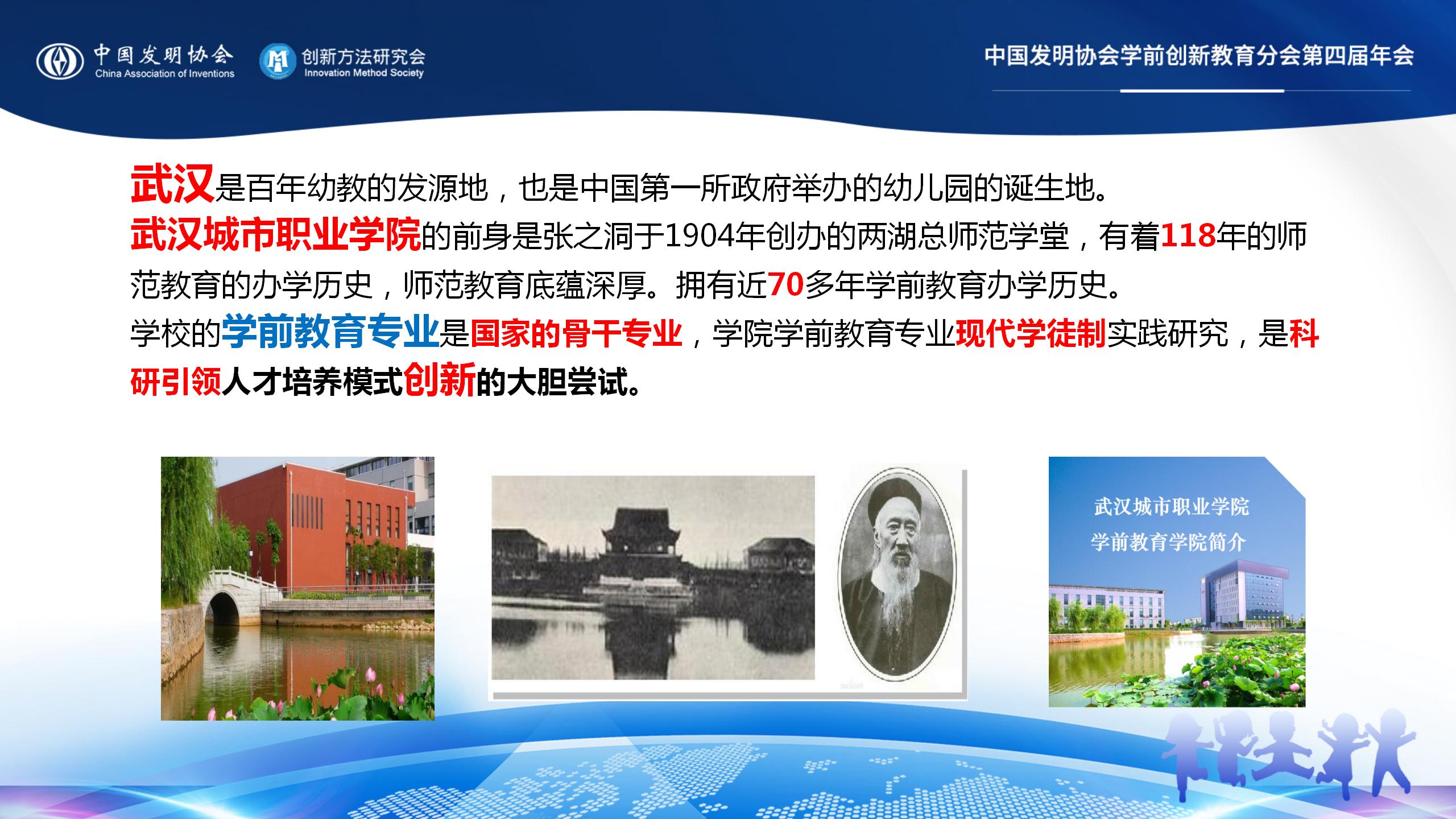 夏教授向我们介绍了武汉是百年幼教的发源地,也是中国第一所政府举办的幼儿园的诞生地。武汉城市职业学院的前身是张之洞于1904年创办的两湖总师范学堂,有着118年的师范教育的办学历史,师范教育底蕴深厚。拥有近70多年学前教育办学历史。学校的学前教育专业是国家的骨干专业,学院学前教育专业现代学徒制实践研究,是科研引领人才培养模式创新的大胆尝试。