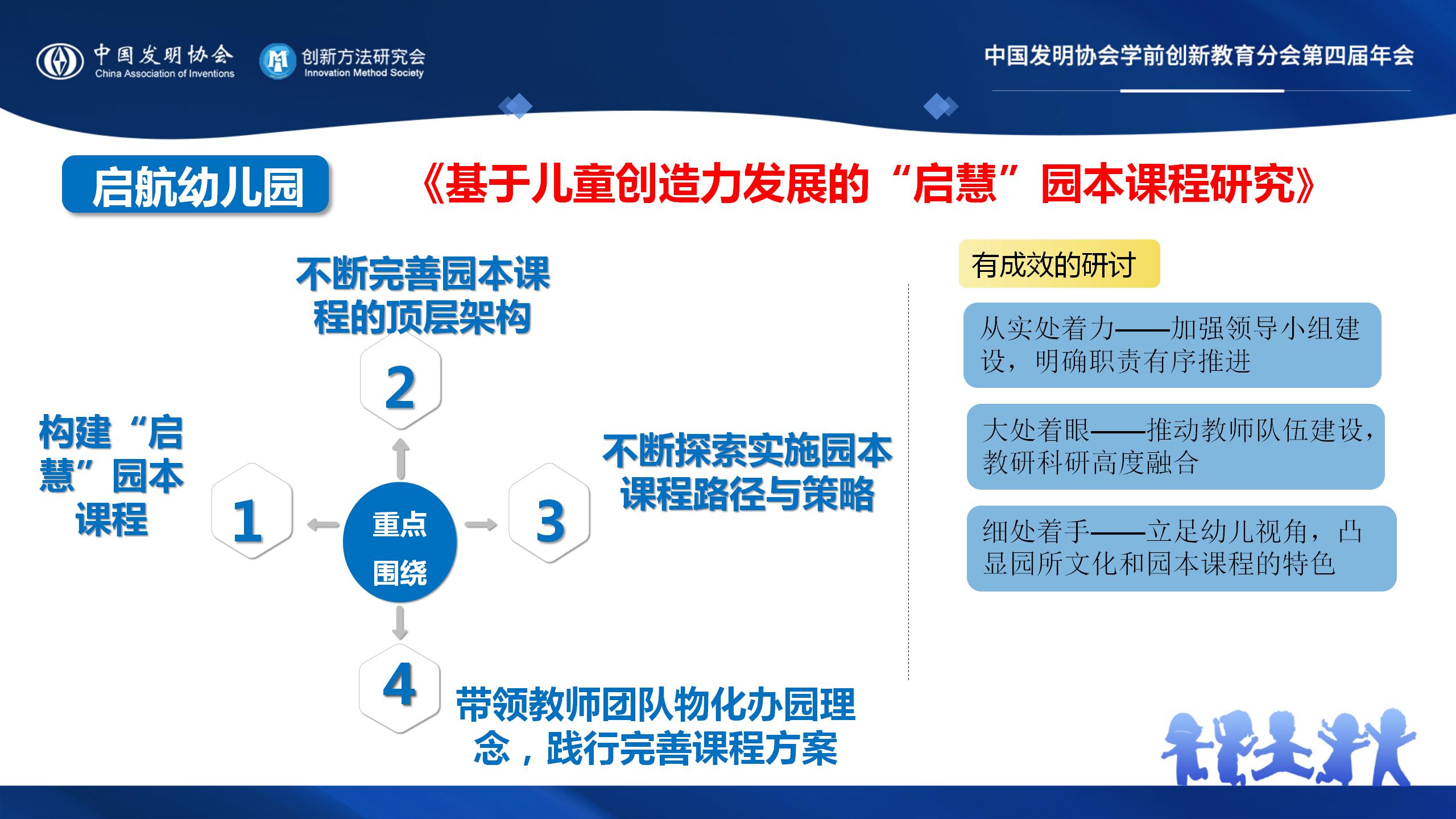 《基于儿童创造力发展的“启慧”园本课程研究》主要围绕着构建“启慧”园本课程,不断完善园本课程的顶层架构,不断探索实施园本课程的路径与策略,带领教师团队在物化办园理念,践行完善课程方案。重点围绕“从实处着力——加强领导小组建设,明确职责有序推进;大处着眼——推动教师队伍建设,教研科研高度融合;细处着手——立足幼儿视角,凸显园所文化和园本课程的特色”三方面进行卓有成效的研讨。