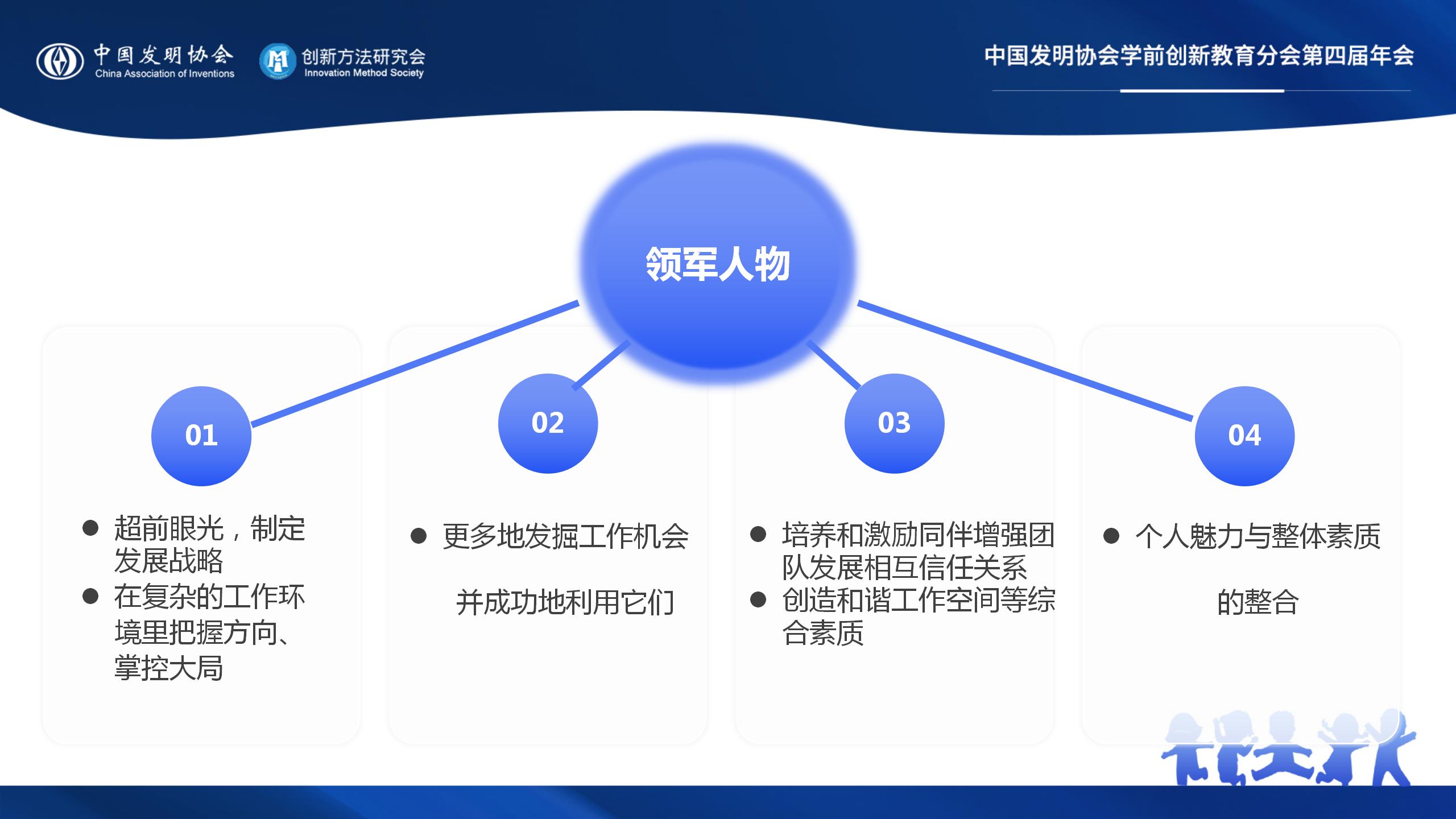 领军人物有超前眼光,制定发展战略,能够在复杂的工作环境里把握方向,掌控大局,更多地发掘工作机会并成功地利用它们;培养和激励同伴增强团队发展相互信任关系,创造和谐工作空间等综合素质。领军人物是个人魅力与整体素质的整合。