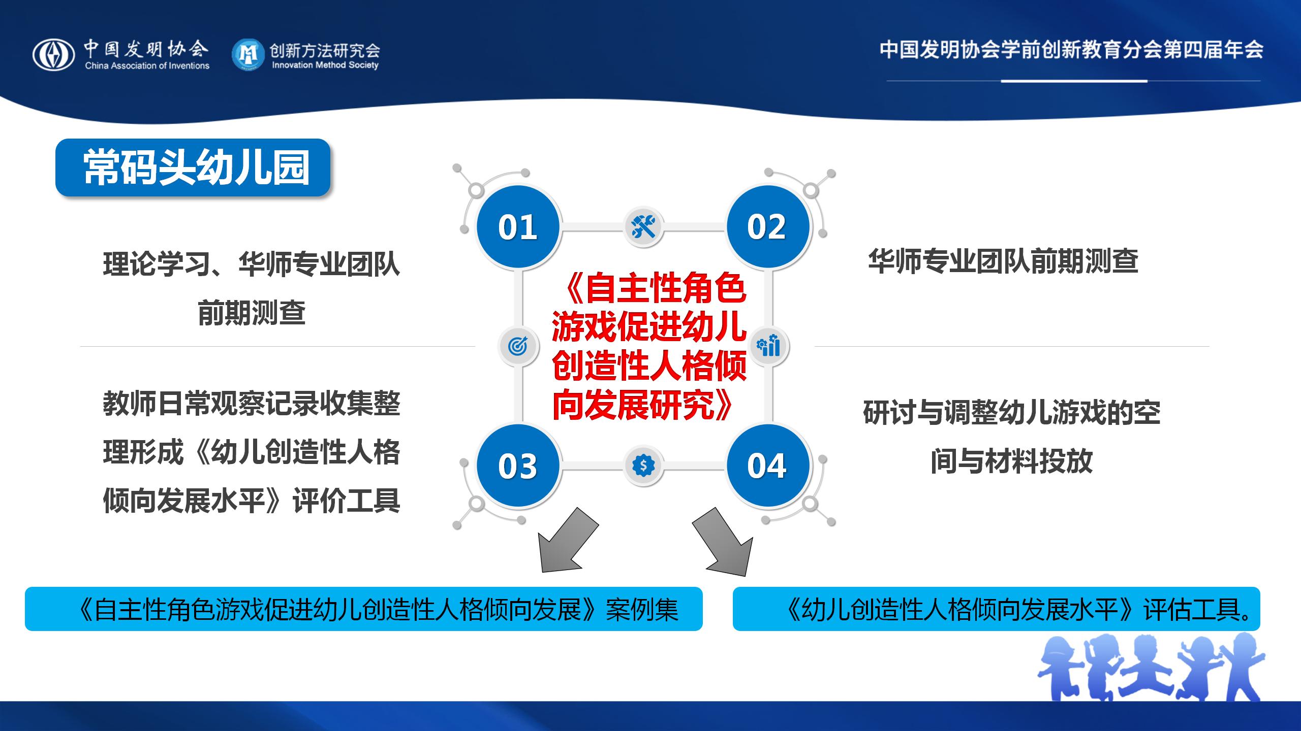 《自主性角色游戏促进幼儿创造性人格倾向发展研究》通过四个阶段完成理论学习、华师专业团队前期测查、教师日常观察记录收集整理形成《幼儿创造性人格倾向发展水平》评价工具、研讨与调整幼儿游戏的空间与材料投放,形成了《自主性角色游戏促进幼儿创造性人格倾向发展》案例集、《幼儿创造性人格倾向发展水平》评估工具。
