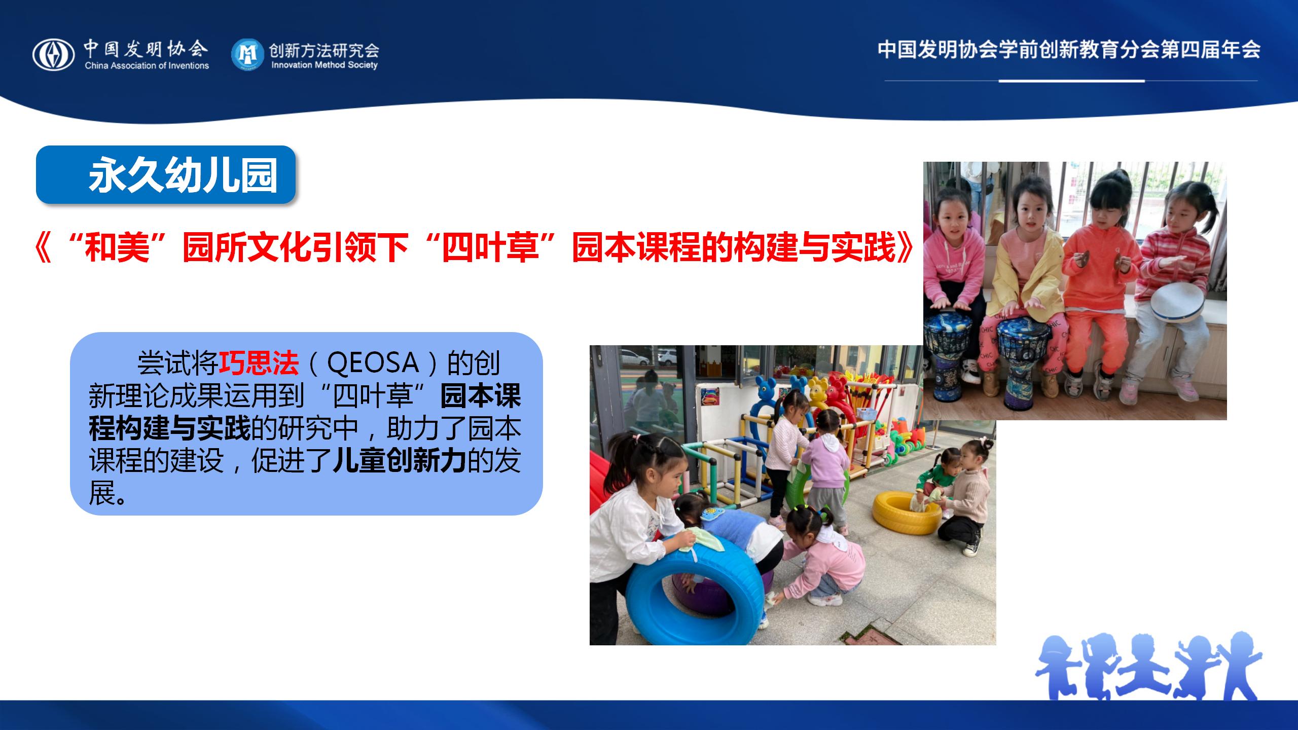 《“和美”园所文化引领下“四叶草”园本课程的构建与实践》尝试将巧思法(QEOSA)的创新理论成果运用到“四叶草”园本课程构建与实践的研究中,助力了园本课程的建设,促进了儿童创新力的发展。
