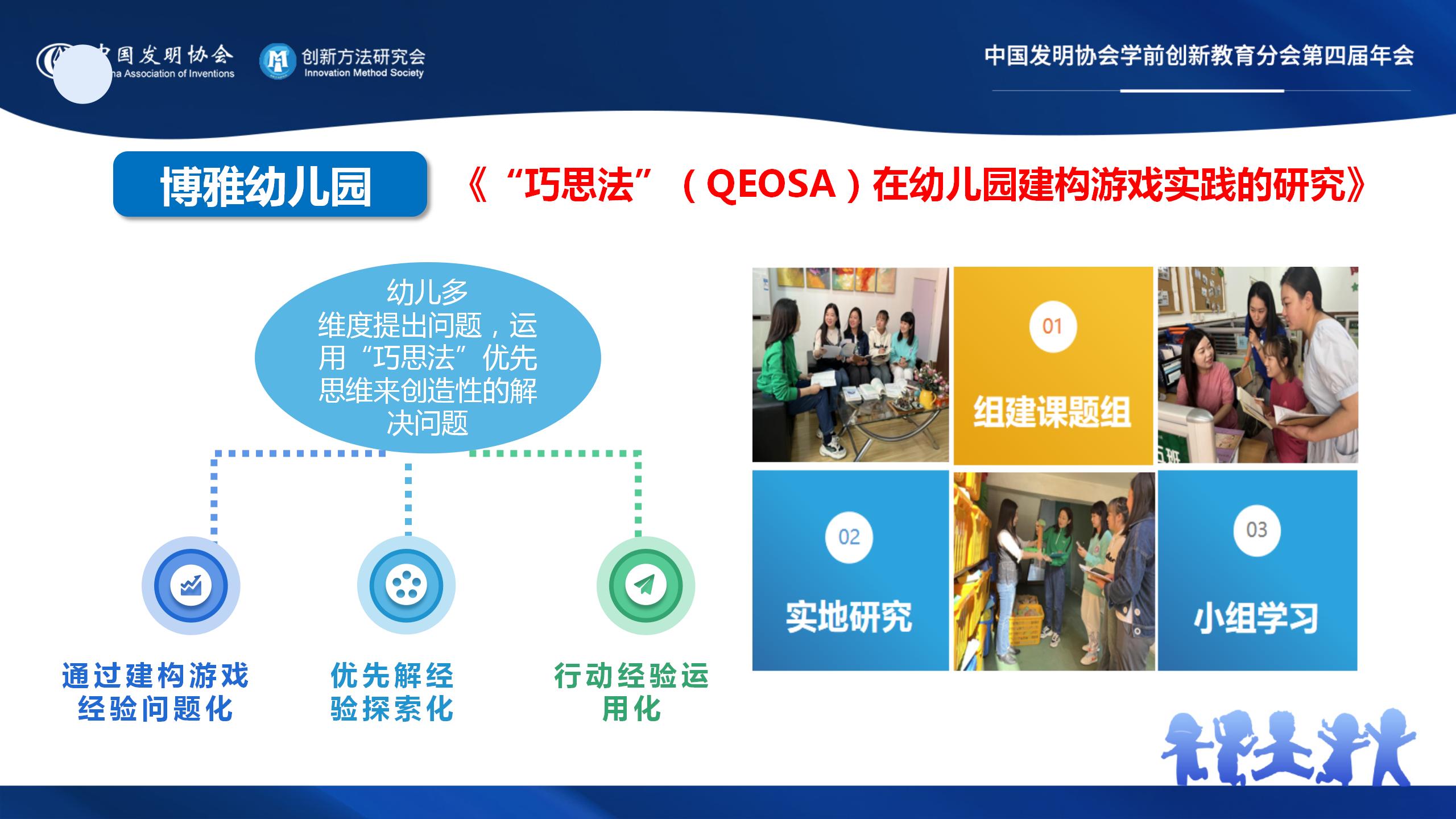 博雅幼儿园《“巧思法”(QEOSA)在幼儿园建构游戏实践的研究》,是让幼儿从多个维度学会提出问题,运用“巧思法”形成优先思维来创造性的解决问题。通过建构游戏经验问题化、优先解经验探索化、行动经验运用化,“由表及里”进行研究,将思维能力与学习品质,方法与技巧、知识与经验融为一体,使幼儿获得多元发展。