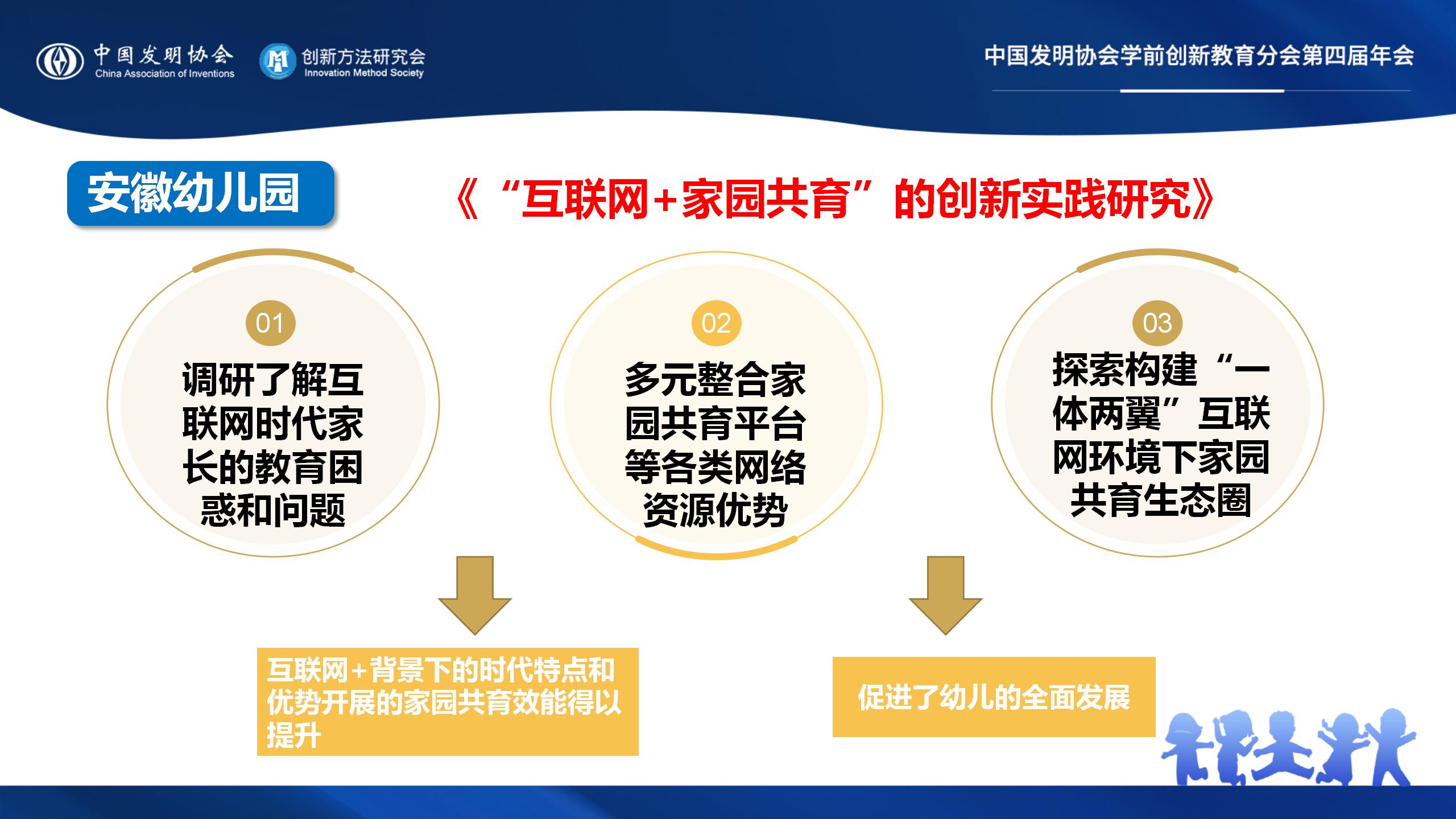 《“互联网+家园共育”的创新实践研究》通过定期调研了解互联网时代家长的教育困惑和问题、多元整合家园共育平台等各类网络资源优势、探索构建“一体两翼”互联网环境下家园共育生态圈,使基于互联网+背景下的时代特点和优势开展的家园共育效能得以提升,促进了幼儿的全面发展。