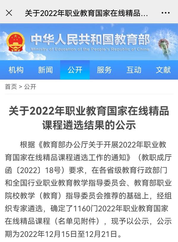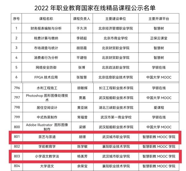 近日,教育部职业教育与成人教育司发布《关于2022年职业教育国家在线精品课程遴选结果的公示》,学校旅游与酒店管理学院《茶艺与茶道》、初等教育学院《小学语文教学法》两门课程入选2022年职业教育国家在线精品课程。