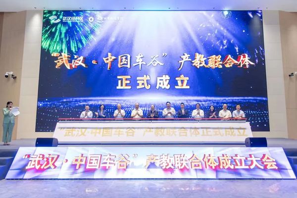 与会领导嘉宾共同推杆,宣告以武汉经济技术开发区智能制造产业园、智能网联和电动汽车产业园为依托,由208家高校、职业院校、企业、行业和科研机构联合打造的“武汉•中国车谷”产教联合体正式成立。
