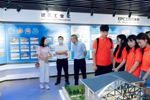 在宝业湖北建工集团有限公司展厅,现场工作人员向师生介绍了宝业湖北建工集团的发展历程和产业布局、装配式建筑发展史和结构体系、EPC工程总承包等,现场通过观看宣传片,学校师生了解到了企业文化及发展情况,学习听取了企业发展、运营方式和人才需求等。