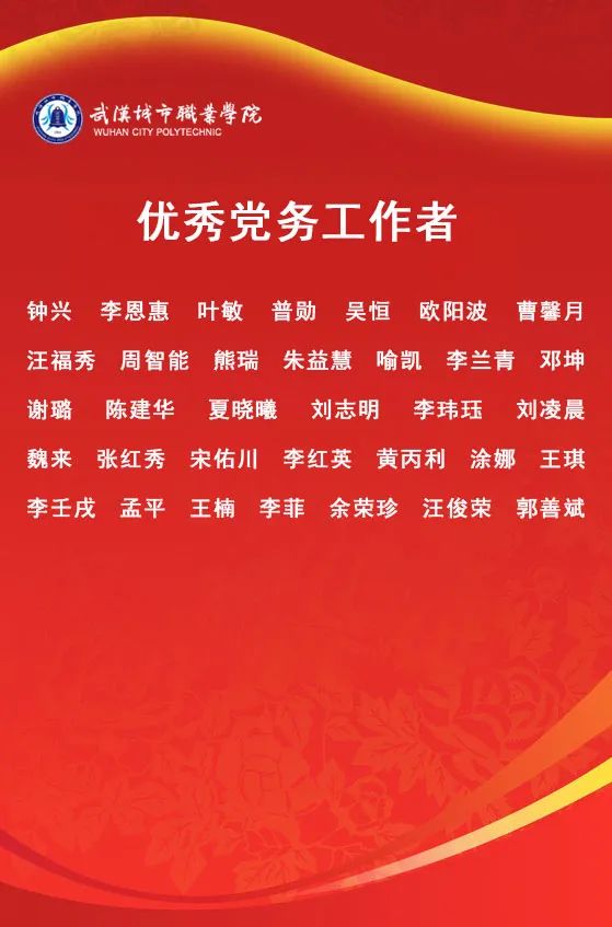 大会宣读了《中共武汉城市职业学院委员会关于表彰优秀共产党员、优秀党务工作者和先进基层党组织的决定》。学校72名“优秀共产党员”、34名“优秀党务工作者” 、15个“先进基层党组织”受到表彰。