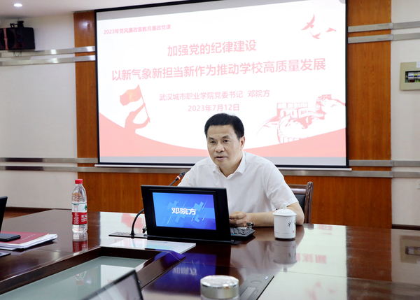 7月12日上午,学校党委理论学习中心组召开扩大学习会。会上,校党委书记邓院方讲授以《加强党的纪律建设 以新气象新担当新作为推动学校高质量发展》为题的廉政党课。他从“深入学习领会习近平总书记关于加强党的纪律建设的重要论述,不断增强贯彻落实的自觉性和坚定性”“以案为鉴 警钟长鸣,筑牢防线 永葆本色”“用好纪律这把管党治党的‘戒尺’,为推动学校高质量发展提供坚强保障”三个方面,为大家讲授了一堂生动而又深刻的廉政党课。