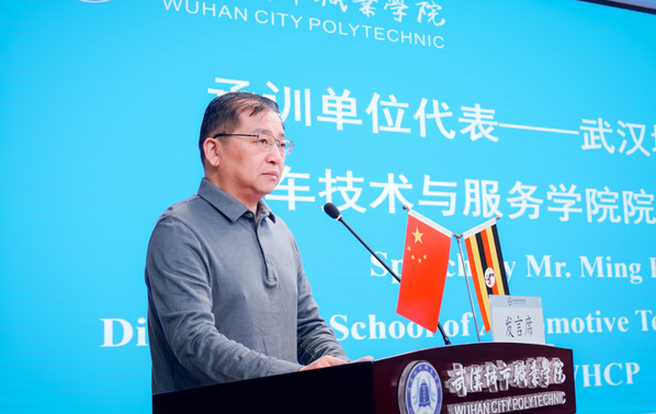 承训单位代表、汽车技术与服务学院院长明平象发言中说到:“2016年以来,我们承接多次乌干达培训。今天,我们再次迎来远方的朋友。我们修订了教学计划,内容更新颖,技术更全面,期待着培训的开启。”