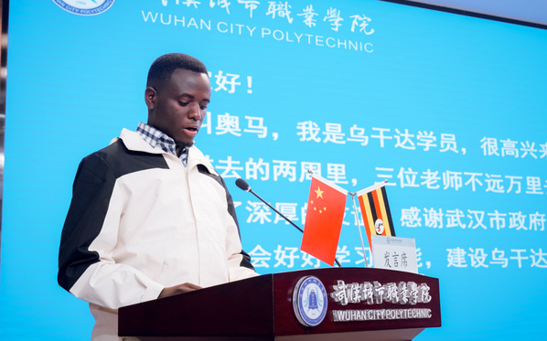 乌干达学员代表贝纳德·帕斯卡尔参加了我校在乌干达举办的汉语言培训,会上用中文深情说到:“在过去的两周里,三位老师不远万里去乌干达,教了我们很多知识,我们结下了深厚的友谊。感谢武汉市政府,感谢武汉城市职业学院!接下来,我们会好好学习技能,建设乌干达。”