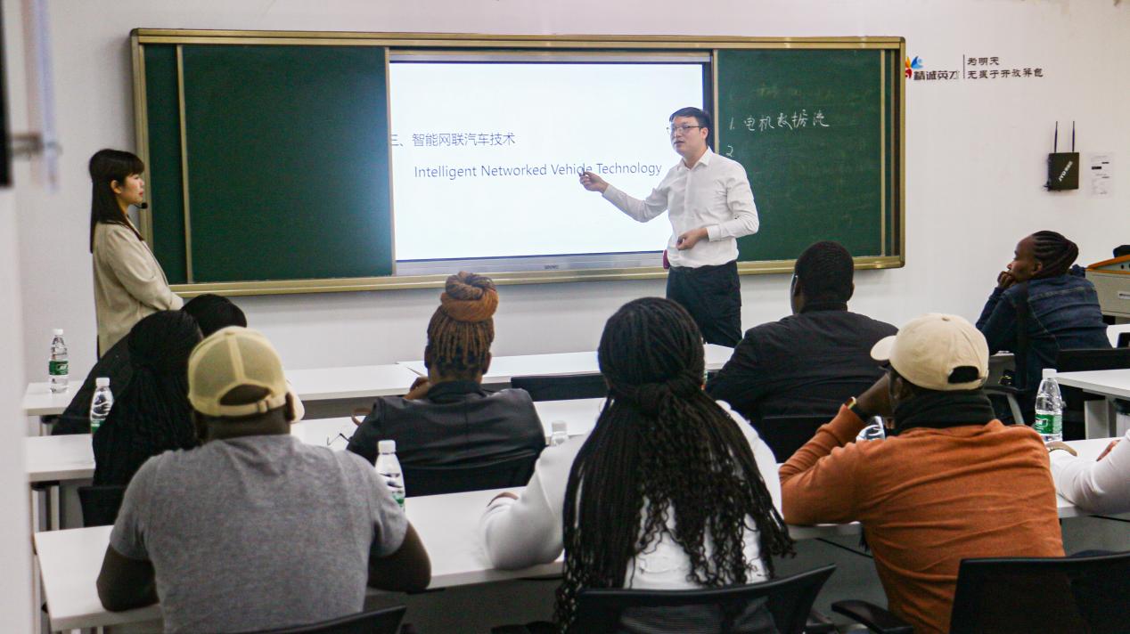 纳米比亚学员首先来到汽车技术与服务学院实训基地“匠之家”,聆听了一堂有关学院基本情况和智能网联汽车技术的课。赵聪老师给学员耐心讲解了智能汽车的定义以及智能网联汽车的重要组成部分,让纳米比亚学员大开眼界。