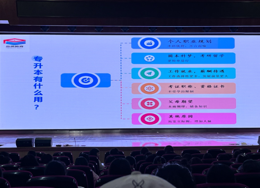 首先,蒋老师帮助同学们分析了专升本的目的和作用。从个人职业规划、圆本科梦到考研留学,从工作就业、薪酬待遇到考证职称、资格证书,还有父母期望和其他原因,蒋丰俊老师都逐一做了解释,帮助同学们进一步明确了未来的职业规划方向。