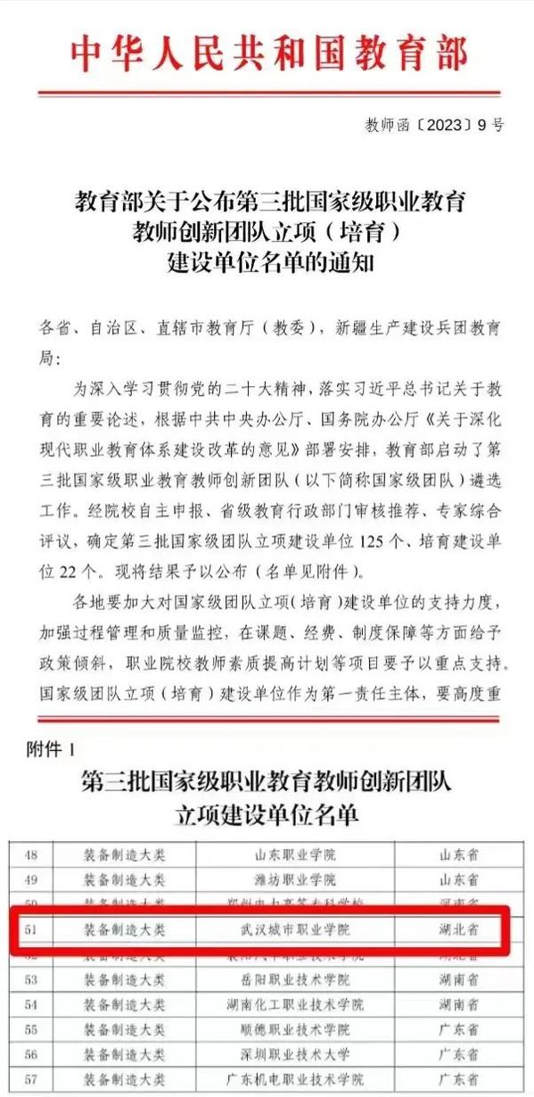 2023年,《教育部关于公布第三批国家级职业教育教师创新团队立项(培育)建设单位名单的通知》(教师函〔2023〕9号)公布了第三批国家级职业教育教师创新团队立项建设单位名单,学校成功入选国家级职业教育教师创新团队立项建设单位,机械制造及自动化专业团队获批国家级职业教育教师创新团队立项。
