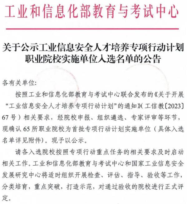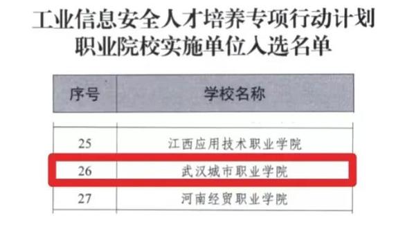 近日,工业和信息化部教育与考试中心发布《关于公示工业信息安全人才培养专项行动计划高等院校实施单位入选名单的公告》和《关于公示工业信息安全人才培养专项行动计划职业院校实施单位入选名单的公告》,公布首批专项行动计划实施单位,湖北省有6所院校入选,学校是唯一一所入选的高职院校。