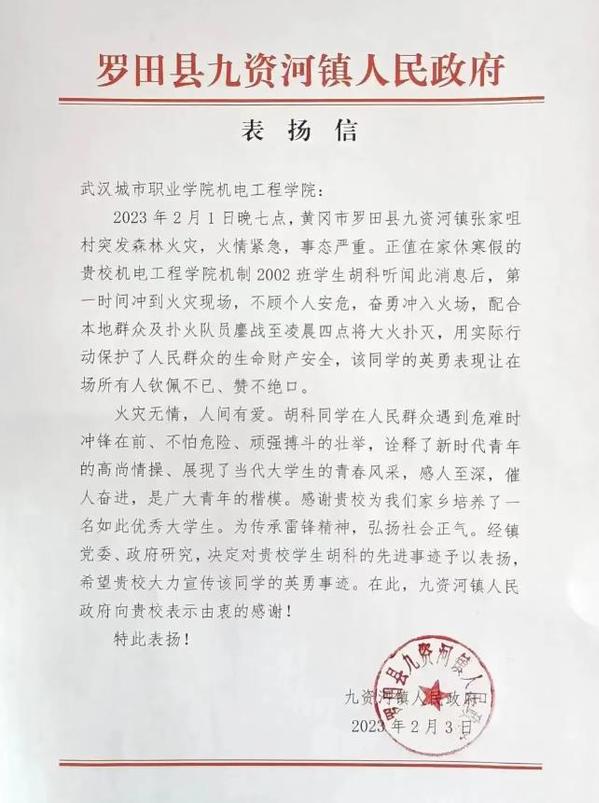 一封寄到学校的感谢信,让胡科的事迹被大家所知晓——连续9个小时、两次冲上山头,协助消防人员,扑灭老家山头上的大火。