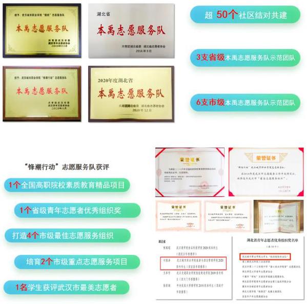 大学生社区实践计划“有心有意”。立足校园、服务社会,学校坚持超过10年服务街道、社区、福利院等机构,获评1个全国高职院校素质教育精品项目、1个省级青年志愿者优秀组织奖,建成2支省级、5支市级本禹志愿服务队示范团队,4支市级“最佳志愿服务组织”,为美丽江城蓬勃发展贡献青春力量。2023年新增1个“武汉市最佳志愿服务组织”,1支服务队入选“完整社区建设试点”项目,3个学院获评湖北省“大学生社区实践计划”优秀组织单位。