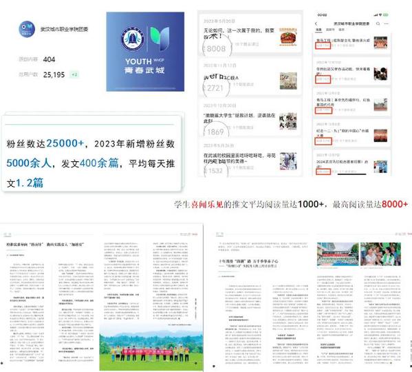 学校团委主动建强“青言青语”主阵地。构建覆盖全校青年的“青春武城”宣传矩阵,其中校团委微信公众号2023年新增粉丝数5000余人,发文400余篇,推文平均阅读量逾1000次,实现了关注量阅读量和点赞量的跨越式提升。《十年漫漫锋潮路,万千拳拳赤子心》《涵养源头活水,不负育人使命,在培育新时代好青年的道路上笃行不怠》《校准需求导向“指南针”,跑出实践育人“加速度”》三篇文章在《中国共青团》杂志刊载,学校共青团工作经验得到进一步凝练和更广泛推介。