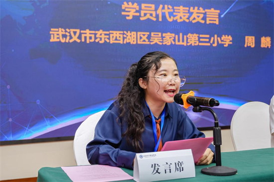 学员代表、来自东西湖区吴家山第三小学的周麟老师也在仪式上发言。她表达了对培训机会的珍惜之情,并承诺将全力以赴投入学习,不断提升自我,为武汉市小学科学教育贡献自己的力量。