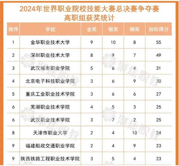 根据统计,2024年世界职业院校技能大赛总决赛争夺赛高职组共有844所学校获奖,共计获奖2813项。其中,金奖495项,银奖911项,铜奖1407项。