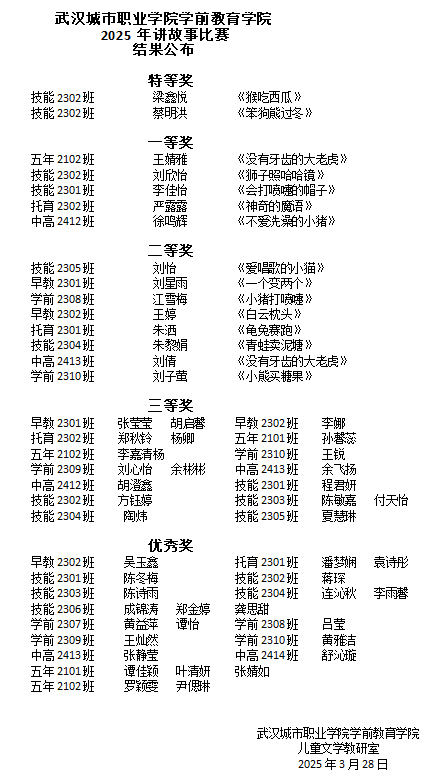 2025年3月28日中午1时,武汉城市职业学院学前教育学院一年一度的讲故事比赛决赛在北校区小礼堂举行。学前教育学院2023、2024级全体学生通过网络直播收看了此次比赛。来自2023级学前、早教、托育以及21级五年制班的讲故事能手同台竞技。学前教育学院儿童文学教研室全体教师担任了此次比赛的评委。