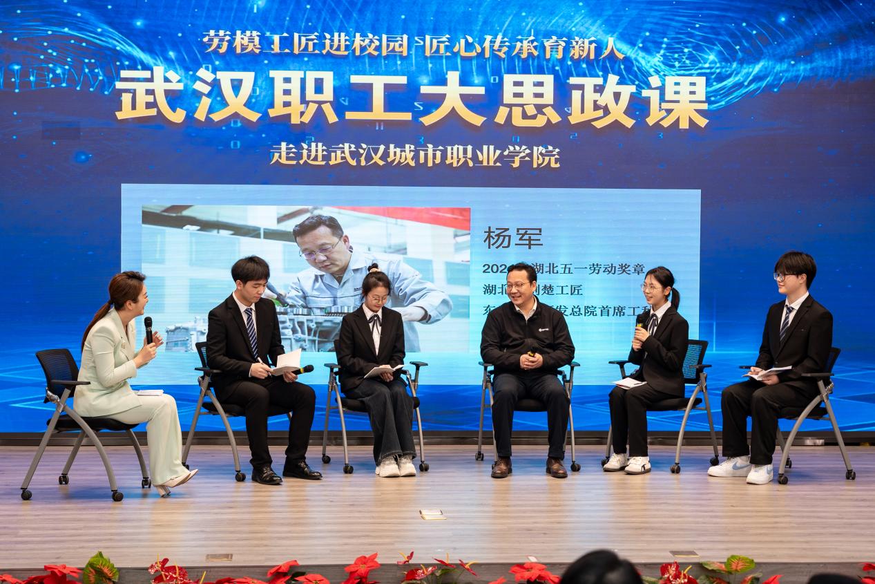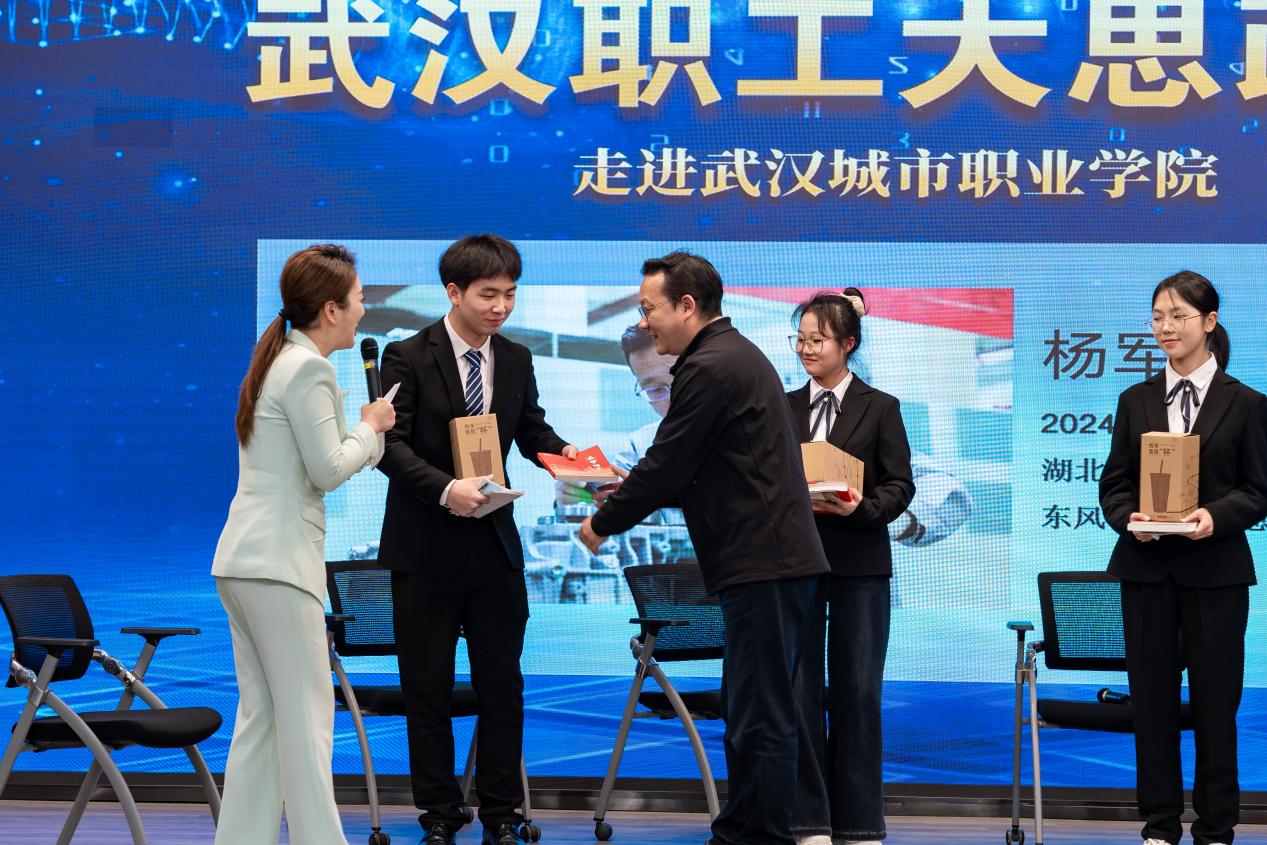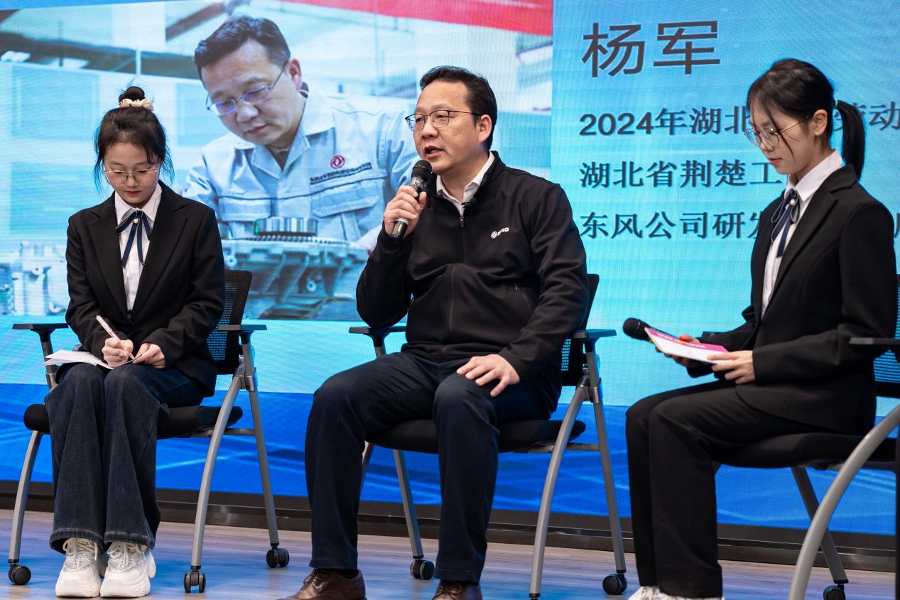 湖北省荆楚工匠、武汉市劳动模范、东风公司研发总院首席工种师杨军,结合自身经历,为学生代表解答疑惑。他与同学们共同探索“何为匠心”,共讨未来期许、努力方向,耐心回答同学们的问题,并赠予了精心准备的书籍和礼物。