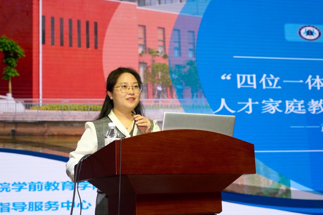 武汉城市职业学院学前教育学院副院长张万红分享了《“四位一体”赋能职前职后托幼人才家庭教育指导服务能力提升》相关研究成果:依托武汉市家庭教育指导服务中心,我校从“政、校、行、企”四位一体协同家庭教育指导服务的实践方面开展了积极探索,学校通过专业赋能,搭建了课程奠基、科研驱动、服务赋能、资源辐射平台。武汉市家庭教育指导服务中心未来将聚焦“精准化服务、数字化升级、优质化指导”,为托幼机构输送“懂家庭、会指导”的复合型人才。