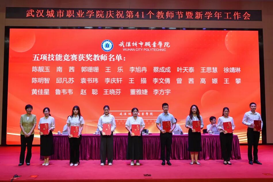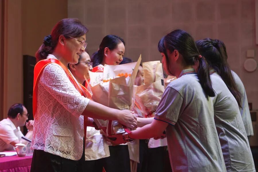 校党委副书记、校长张英为五项技能竞赛获奖代表颁奖、为从教30年教师颁发纪念奖章。其他校领导分别为优秀教师代表、优秀德育工作者代表、优秀教育工作者代表、优秀教师团队颁奖。活动现场,新进教职工代表向从教30年教师献花。