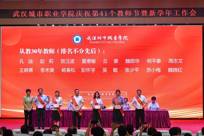 会上,副校长杨春松宣读教师节“四优”表彰文件、武汉市第七届教师五项技能竞赛结果、从教30年教师名单,大会表彰了优秀教师、优秀德育工作者、优秀教育工作者、 优秀教师团队、五项技能竞赛获奖教师,为从教30年教师献花并颁发纪念奖章。