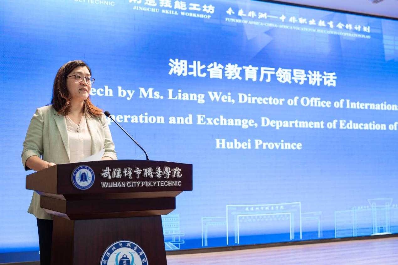 湖北省教育厅对外合作交流处处长梁薇在讲话中肯定了学校在国际化办学方面的努力,包括不断优化机制、健全机构、内培外引,打造了专业高效的国际化团队等。她表示,湖北省教育厅积极推动湖北职业教育“走出去”“引进来”双向发展,学校作为湖北省“具有较高国际化水平职业学校”,连续11年深耕中非职教合作,成果显著,彰显了湖北职业教育的国际影响力。