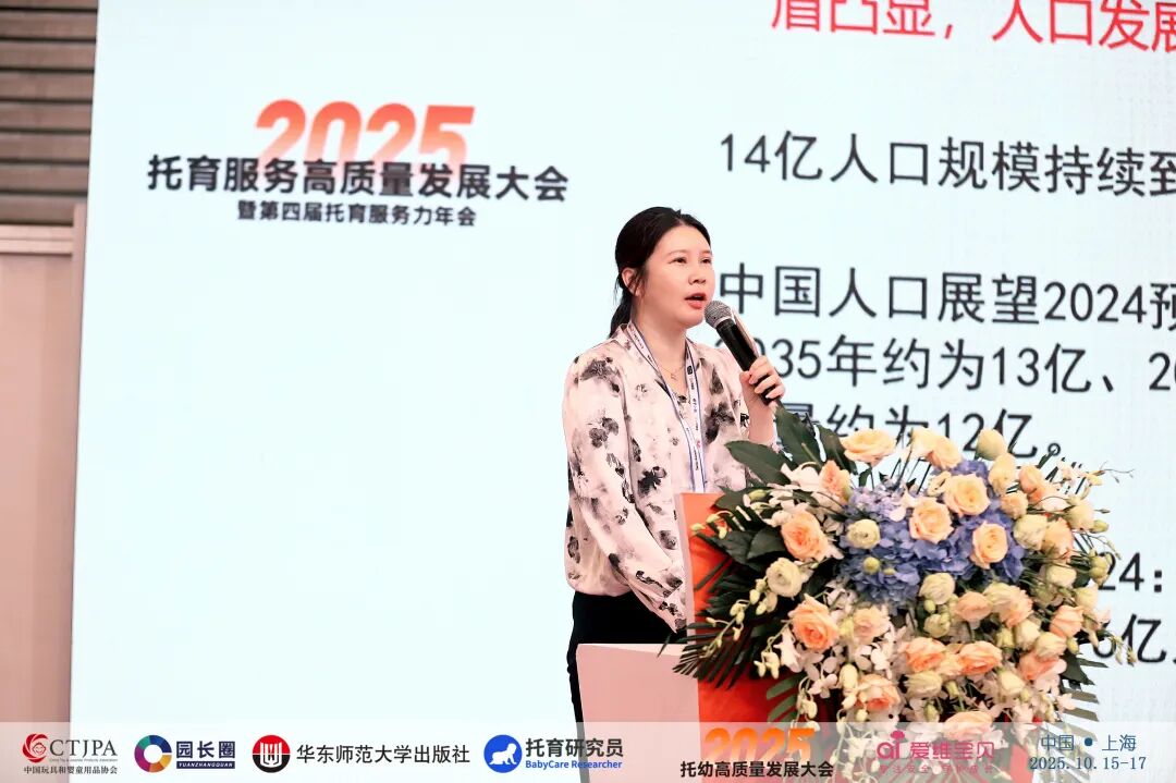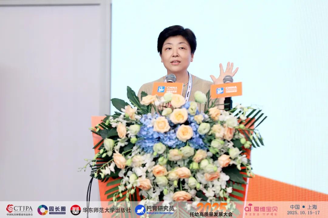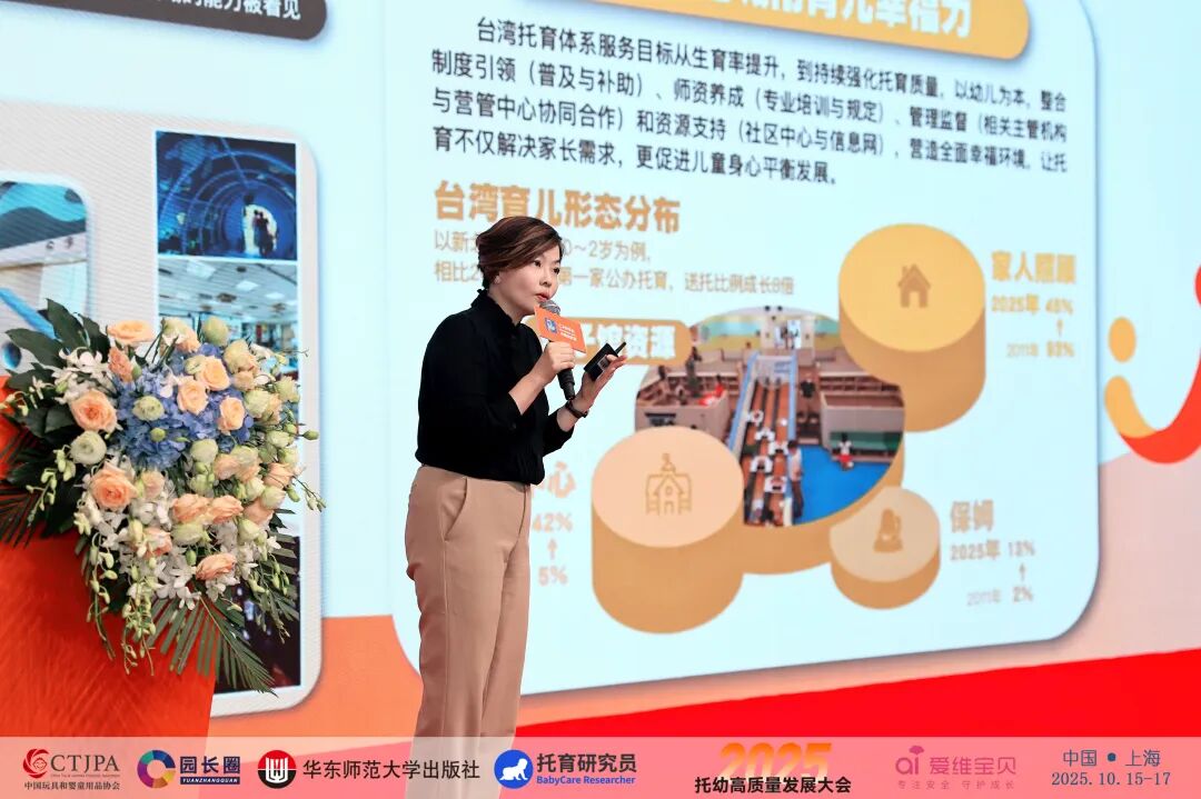 大会将视野拓展到更广阔的两岸视角。台湾省学前教育研究协会理事长、小熊摇篮托育品牌创办人刘惠文,带来主题报告《入托率节节攀升——台湾地区入托婴幼儿与非入托婴幼儿早期综合发展差异化研究》。台湾省学前教育研究协会长期致力于推动两岸托育交流与融合,并在多地设立医教保研究基地与实践基地。