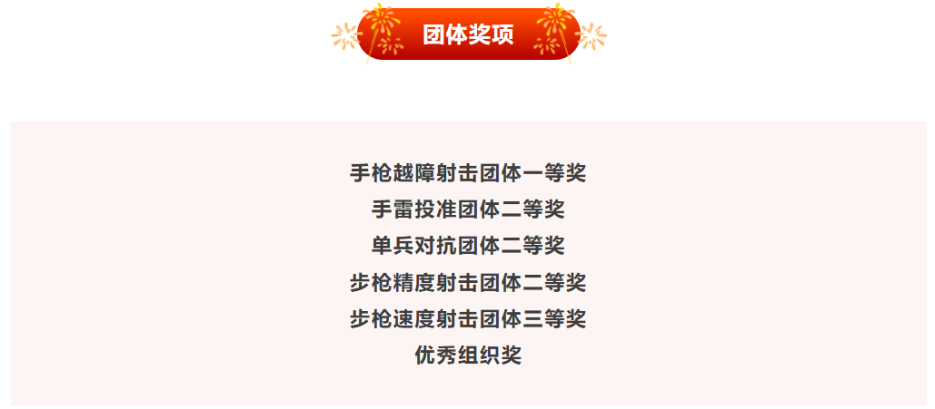本次大赛分为团体项目和男子、女子个人项目。参赛队员在步枪精度射击、步枪速度射击、单兵过障赛、真人cs对抗赛五人模拟巷战和投弹等五个科目中展开比拼。