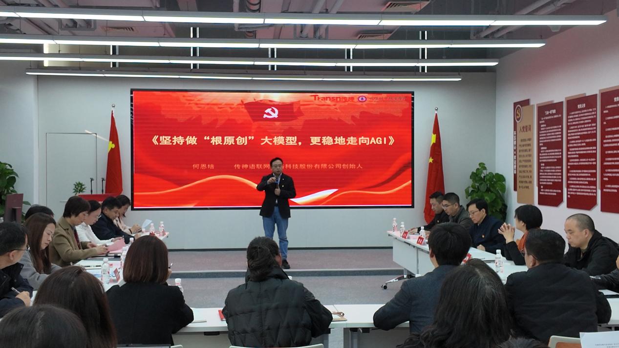 何恩培以《坚持做“根原创”大模型,更稳地走向AGI》为题讲了一堂“微党课”,分享了企业在前沿科技领域的战略思考与实践探索。