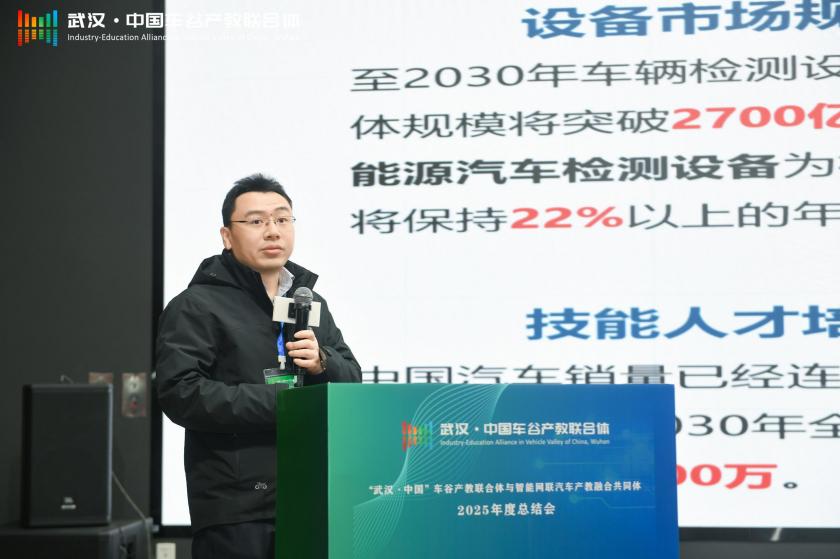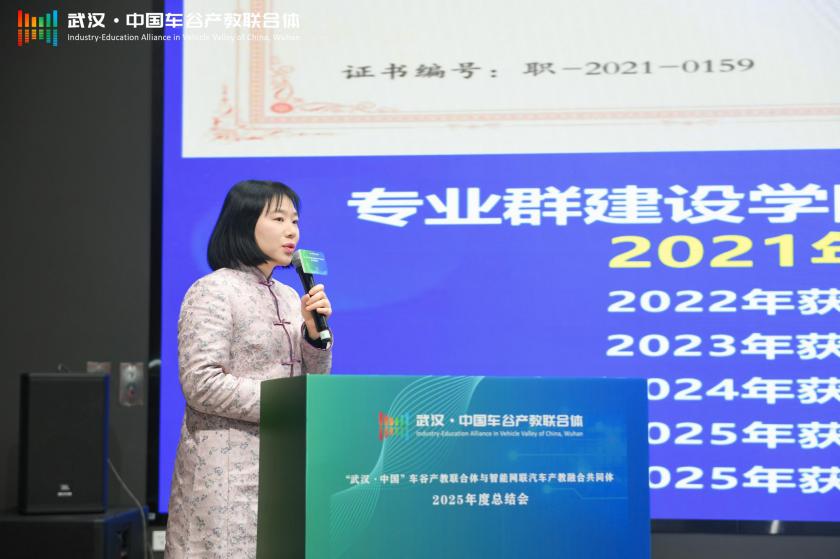 武汉城市职业学院副校长叶学文代表产教联合体秘书处作《“武汉·中国车谷”产教联合体2025年度工作汇报》,总结产教联合体在机制建设、人才培养、建设成效和社会服务等方面的最新进展。