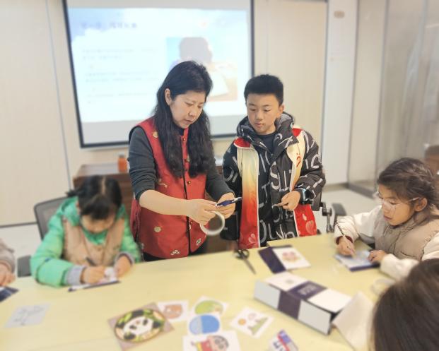 以马年主题开场,劳丹老师首先用生动语言介绍“骠、骝、骏、骐、骥、骓”等马的12种雅称,以中国传统画欣赏形式及马的吉祥寓意,巧妙设计老幼互动环节,既贴合新春氛围,丰富孩子们的传统文化知识,又快速调动现场参与热情。融通志愿者黄谌子瑶辅助掐丝珐琅画教学,从材料介绍到步骤演示,全程贴合幼儿认知;融通志愿者孟晶晶提前调好所有必备材料,及时协助解决现场出现的小状况,两位志愿者都展现出耐心细致的专业素养。