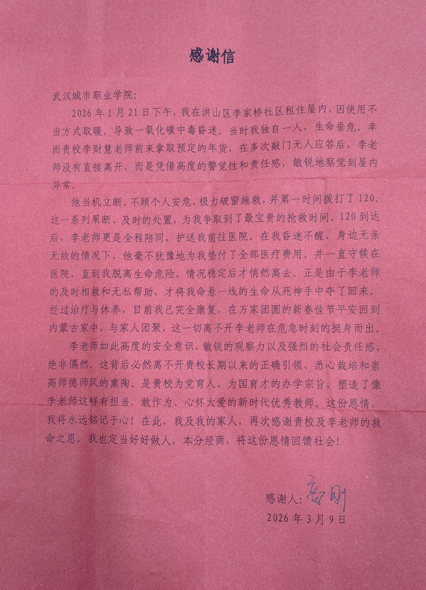 “经过治疗与休养,目前我已完全康复,在万家团圆的新春佳节平安回到家中与家人团聚……”3月10日,一封饱含深情的感谢信和写有“临危施救显本色,大爱无疆暖人心”的锦旗送到武汉城市职业学院,揭开了一段寒冬里的生死救援故事。