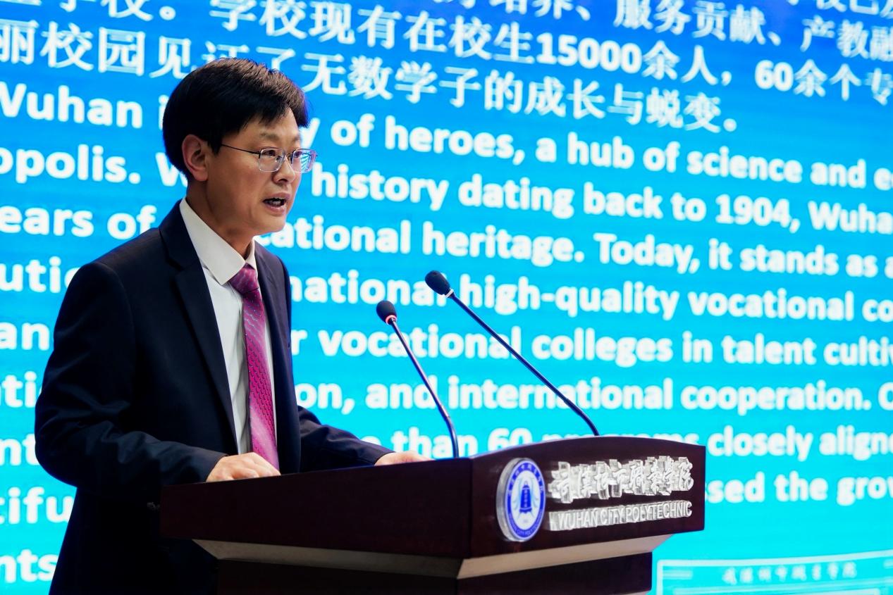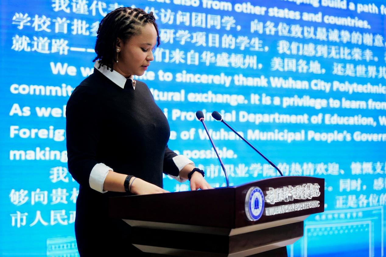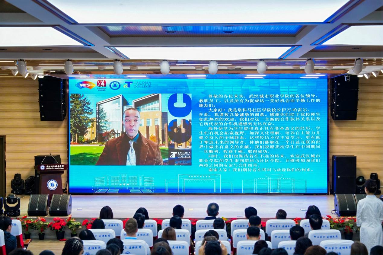 仪式上,美国塔科马社区学院校长伊万·哈雷尔通过视频致辞,表达了对项目启动的祝贺和感谢,以及对两校深化合作的期待。塔科马社区学院学生代表泰勒·安东尼丝·巴伯在发言中表示,非常荣幸能够来到武汉参加此次研学项目,期待通过学习中文、体验职业技能、感受荆楚文化,深入了解中国,与武汉青年结下深厚友谊。