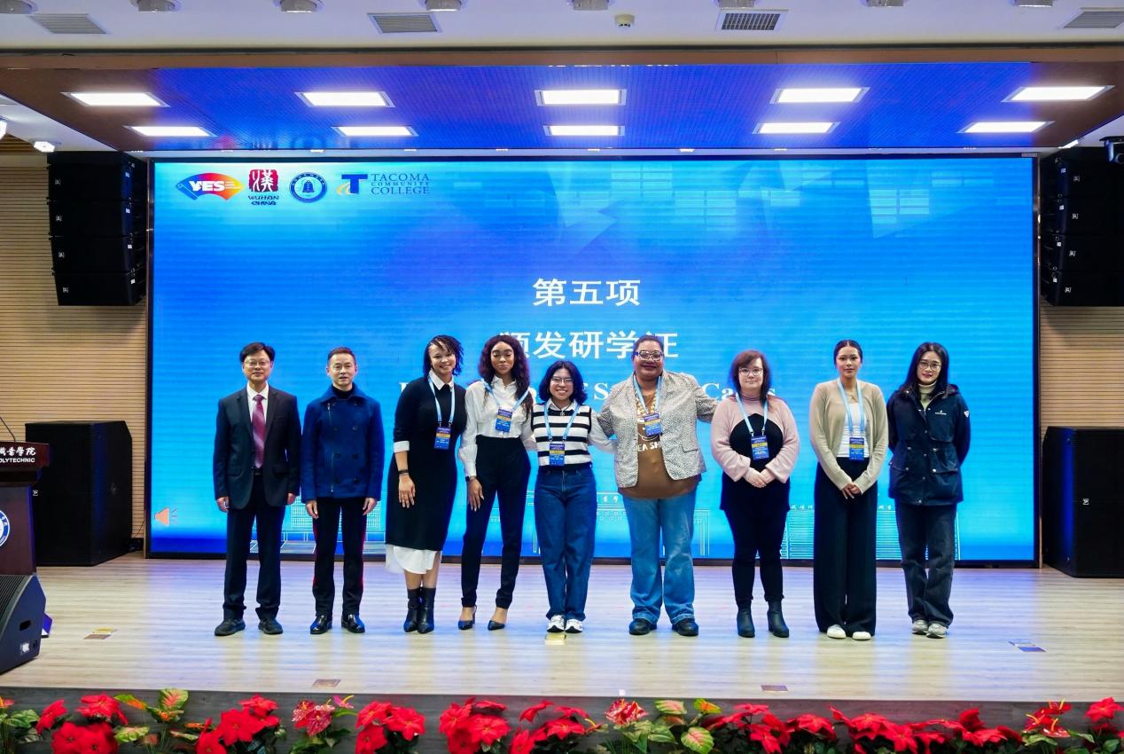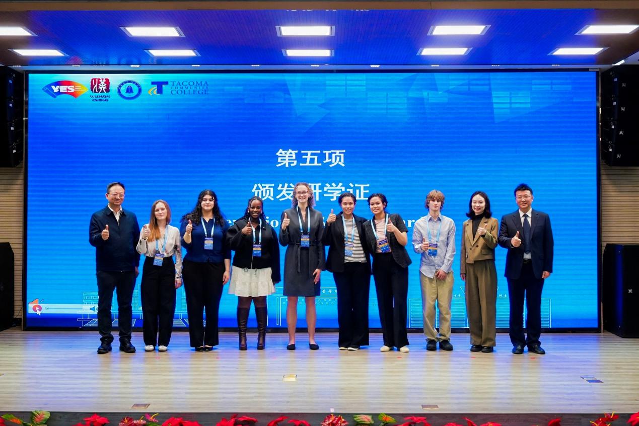 活动中,湖北省教育厅、武汉市委外办、武汉市教育局、学校领导共同为美国塔科马社区学院学生颁发研学证书。