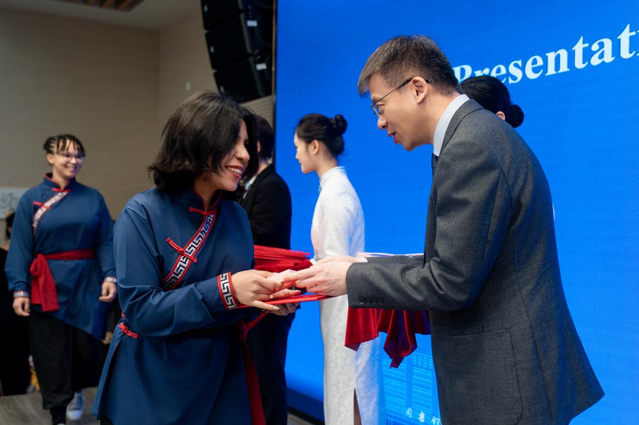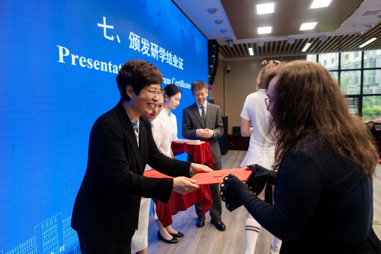 随后,领导们共同为美国学生颁发研学结业证。双方代表互赠纪念品,市外办向美国友人赠送了具有武汉特色的文创产品、武汉城市职业学院赠送了学校自主研发的智能背包,寓意着友谊与科技的交融。