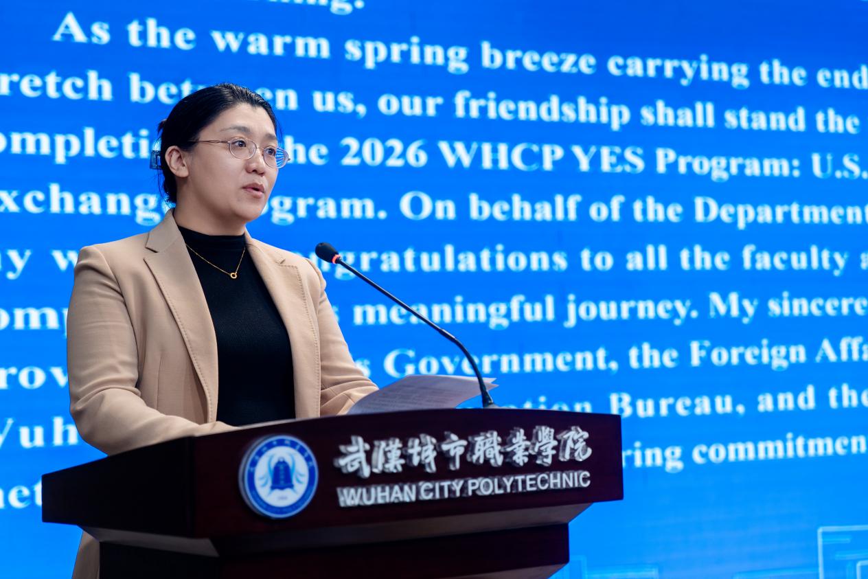 4月2日上午,2026年“汉韵中美,梦想同行”——美国友城青年赴汉“中文+职业技能”研学项目结业仪式在武汉城市职业学院举行。省外办、省教育厅、市外办、市教育局相关领导,美国塔科马社区学院国际项目执行董事詹姆斯・罗纳德・纽曼,学校党委书记张英、校长刘永生等校领导及相关部门负责人、中美师生代表共同出席活动。结业仪式由副校长杨春松主持。